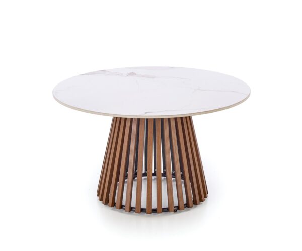 Corina je elegantan klub sto koji kombinuje savremen dizajn i prirodne materijale. Njegova keramička ploča u bež mermer dezenu donosi luksuzan izgled i izuzetnu otpornost, dok postolje od orah MDF-a oblikovano u vertikalne linije daje stolu skulpturalni karakter.